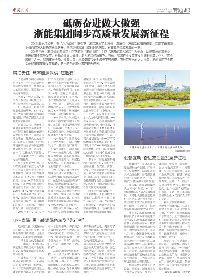 6月18日,中新社《中國新聞》報刊發《砥礪奮進做大做強 浙能集團闊步高質量發展新征程》。