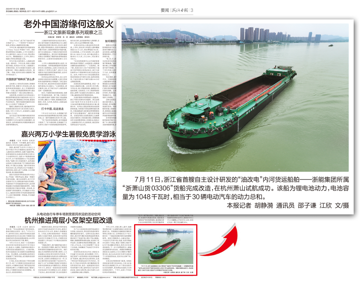 7月11日,潮新聞客戶端報道《浙江首艘!浙能自主研發(fā)“油改電”內(nèi)河貨船試航成功》。 潮新聞客戶端 圖
