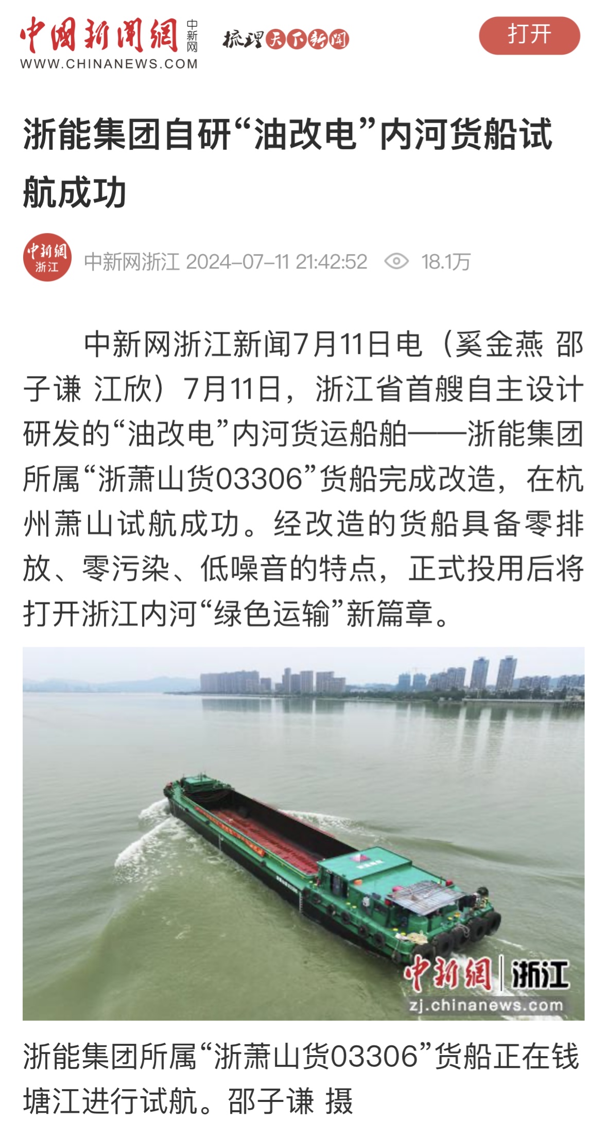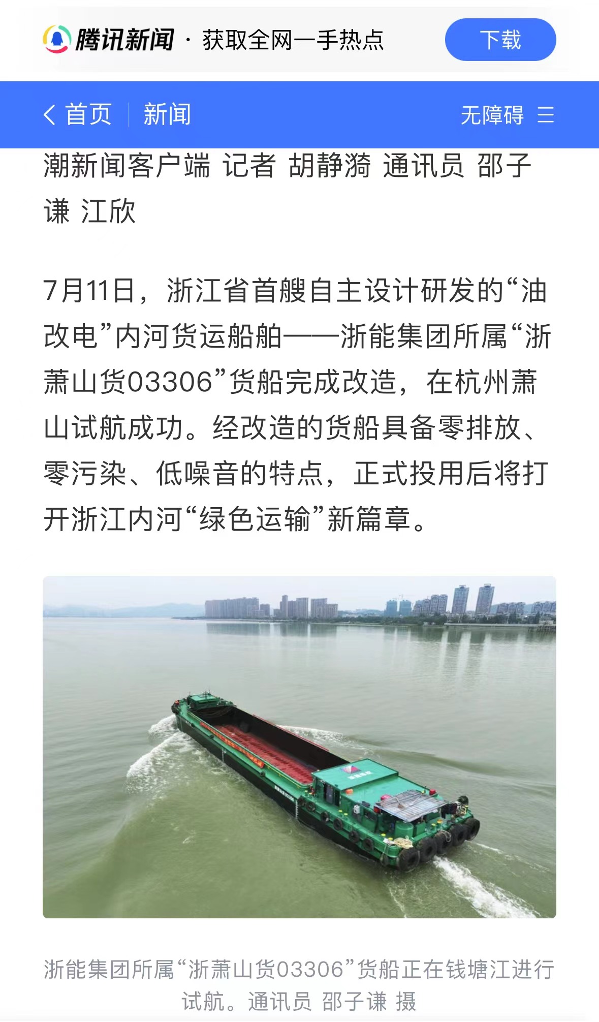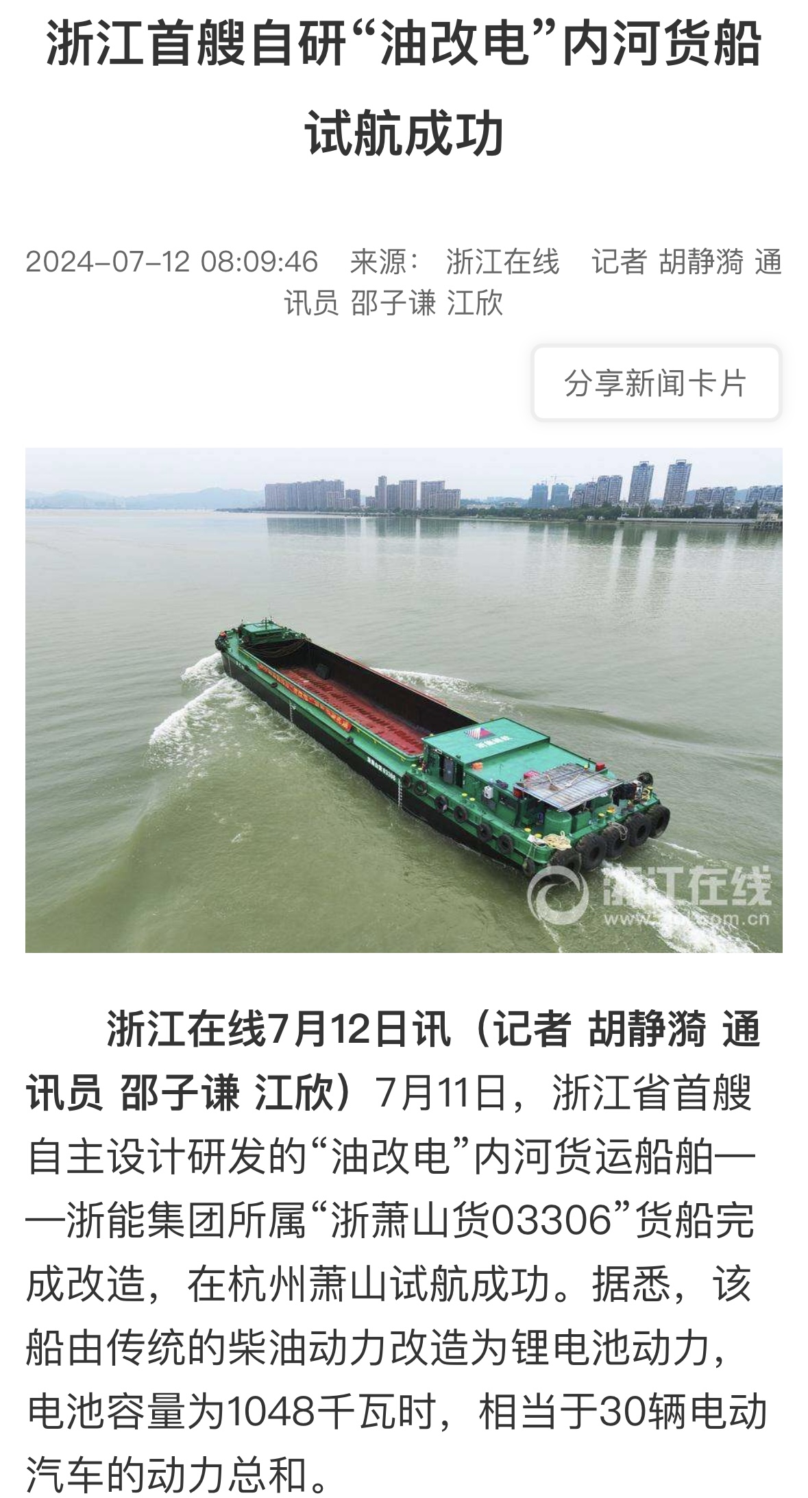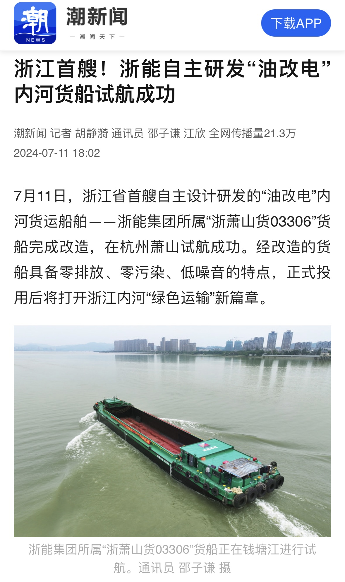 7月11日,中國新聞網(wǎng)報道《浙能集團自研“油改電”內(nèi)河貨船試航成功》。 中國新聞網(wǎng) 圖