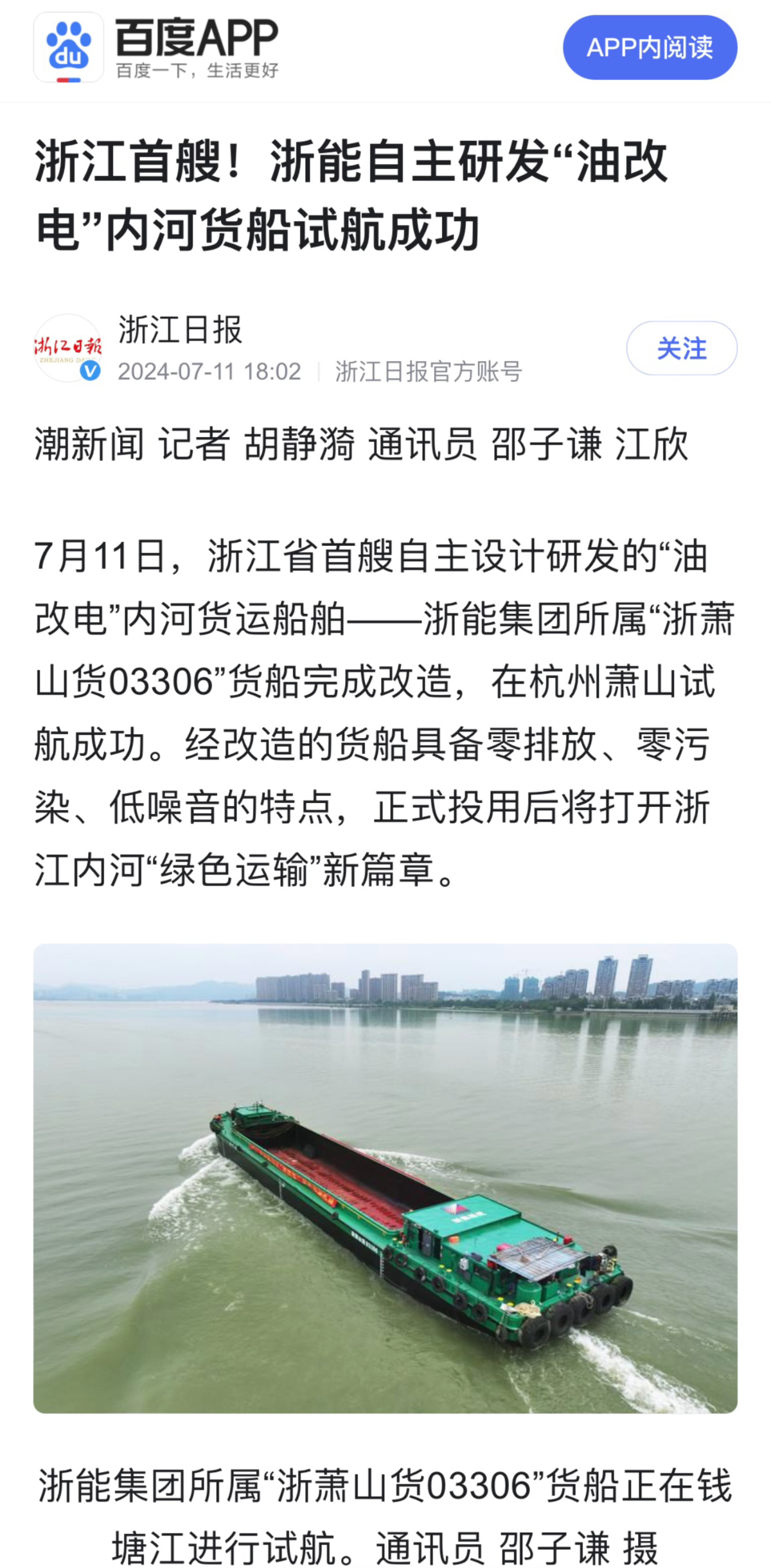 7月11日,百度報道《浙能集團自研“油改電”內(nèi)河貨船試航成功》。 百度 圖