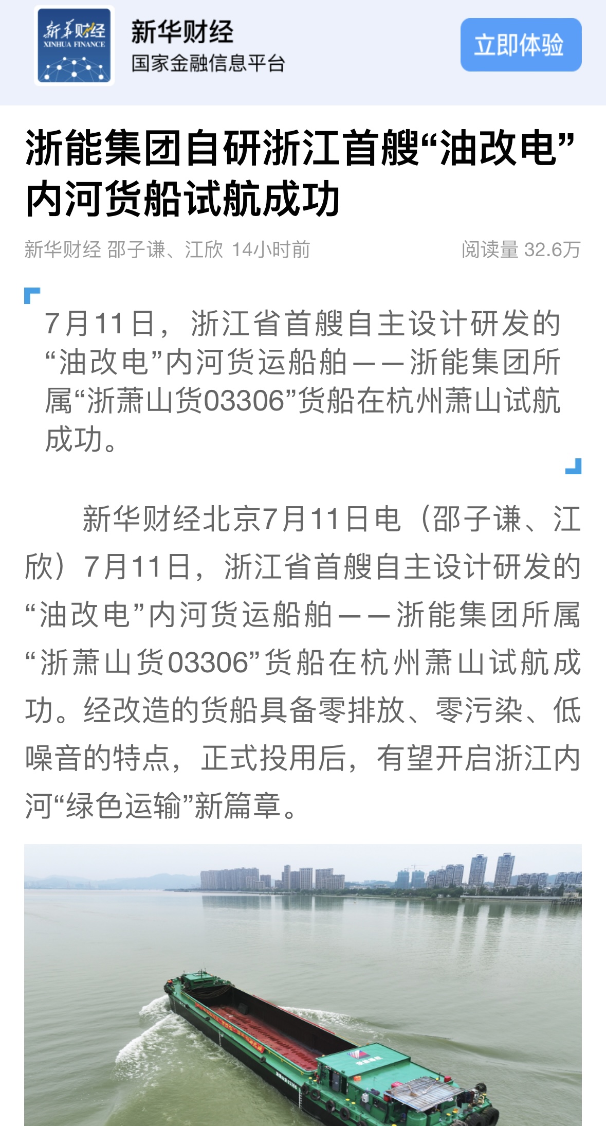 7月11日,新華財經(jīng)報道《浙能集團自研“油改電”內(nèi)河貨船試航成功》。 新華財經(jīng) 圖