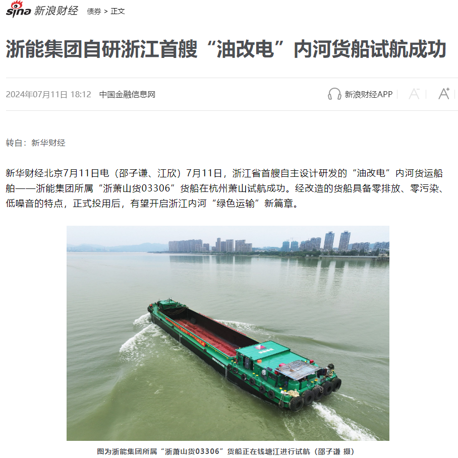 7月12日,新浪財經(jīng)轉(zhuǎn)載報道《浙能集團自研“油改電”內(nèi)河貨船試航成功》。 新浪財經(jīng) 圖