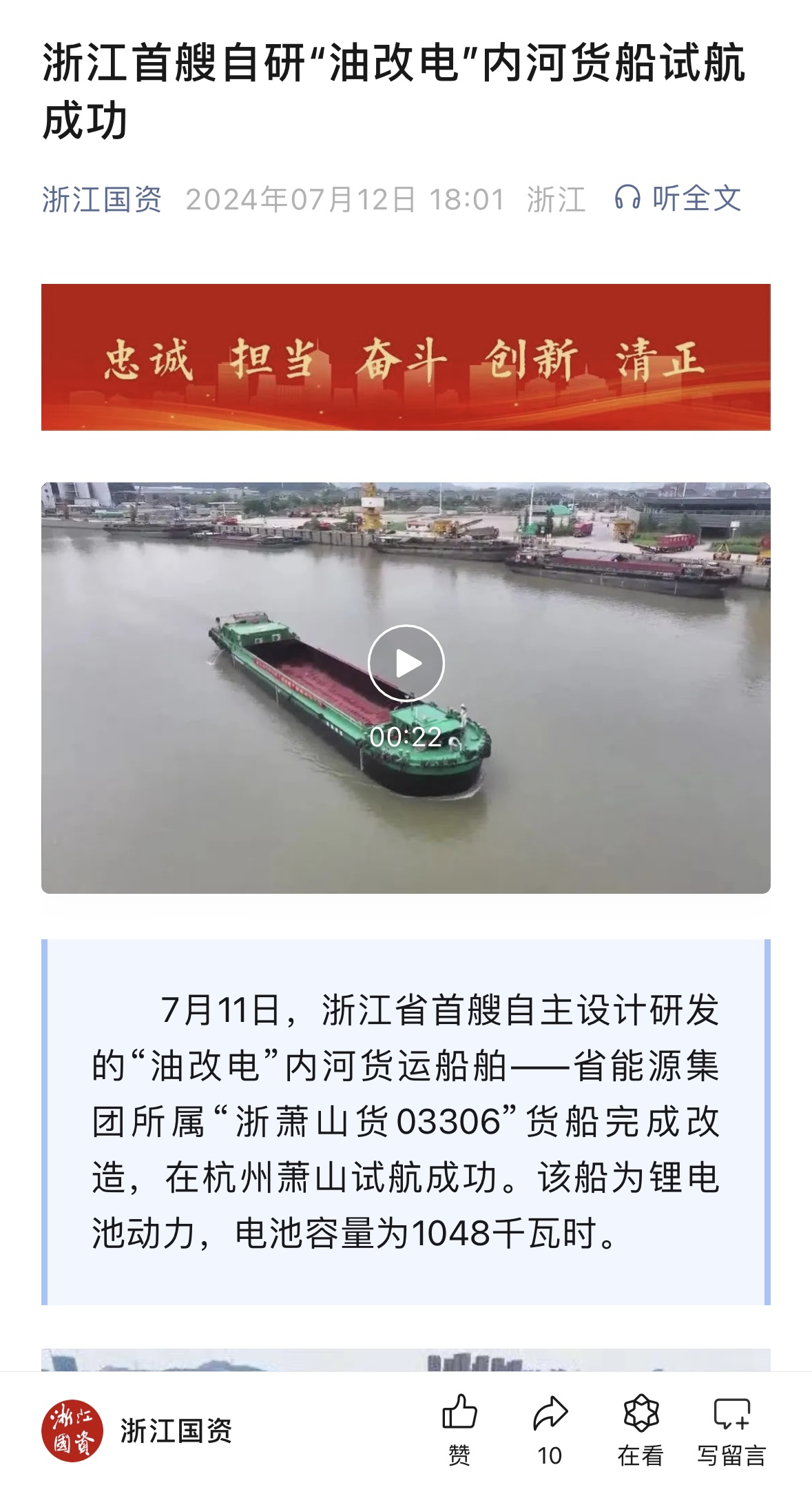 7月12日,浙江在線公眾號報道《浙能集團自研“油改電”內(nèi)河貨船試航成功》。 浙江在線 圖