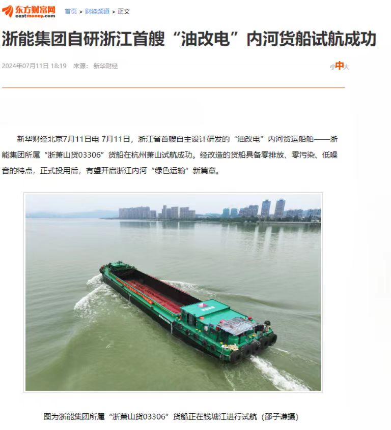 7月12日,東方財富網(wǎng)報道《浙能集團自研“油改電”內(nèi)河貨船試航成功》。 東方財富網(wǎng) 圖