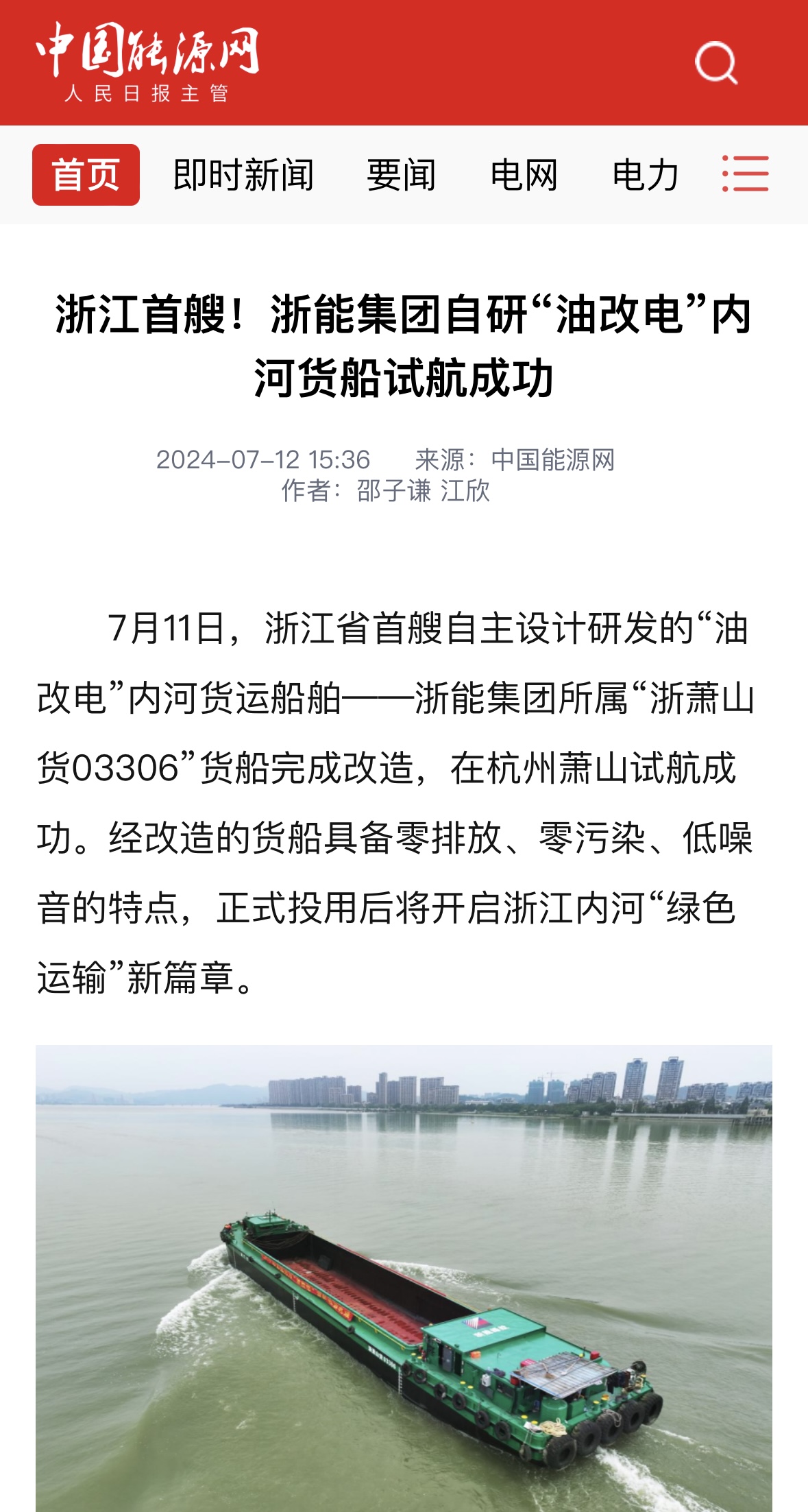 7月12日,中國能源網(wǎng)報道《浙能集團自研“油改電”內(nèi)河貨船試航成功》。 中國能源網(wǎng) 圖