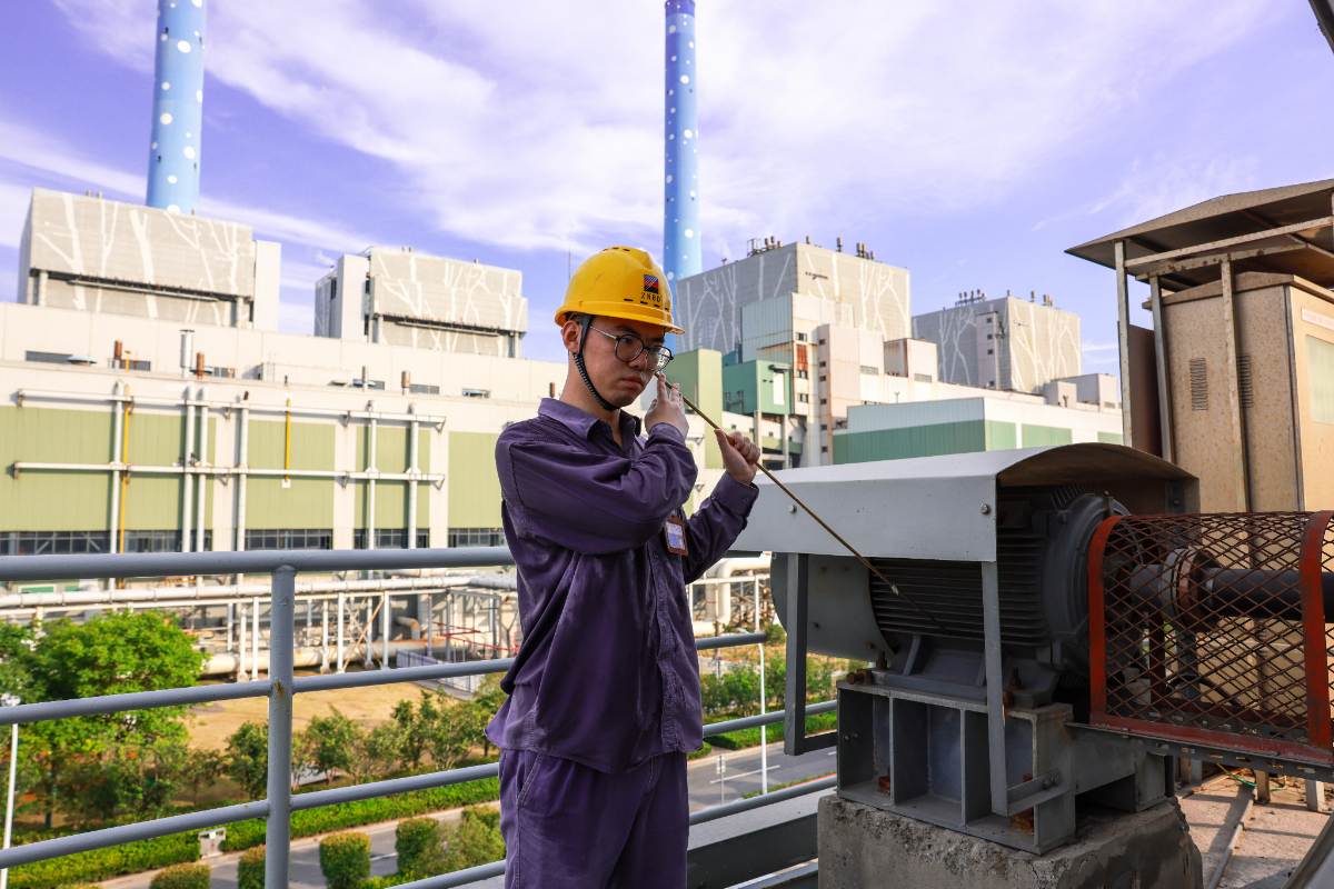 濱電青工周珺查看現場環境和設備狀況,仔細測量溫度、振動等參數。 史勇 攝