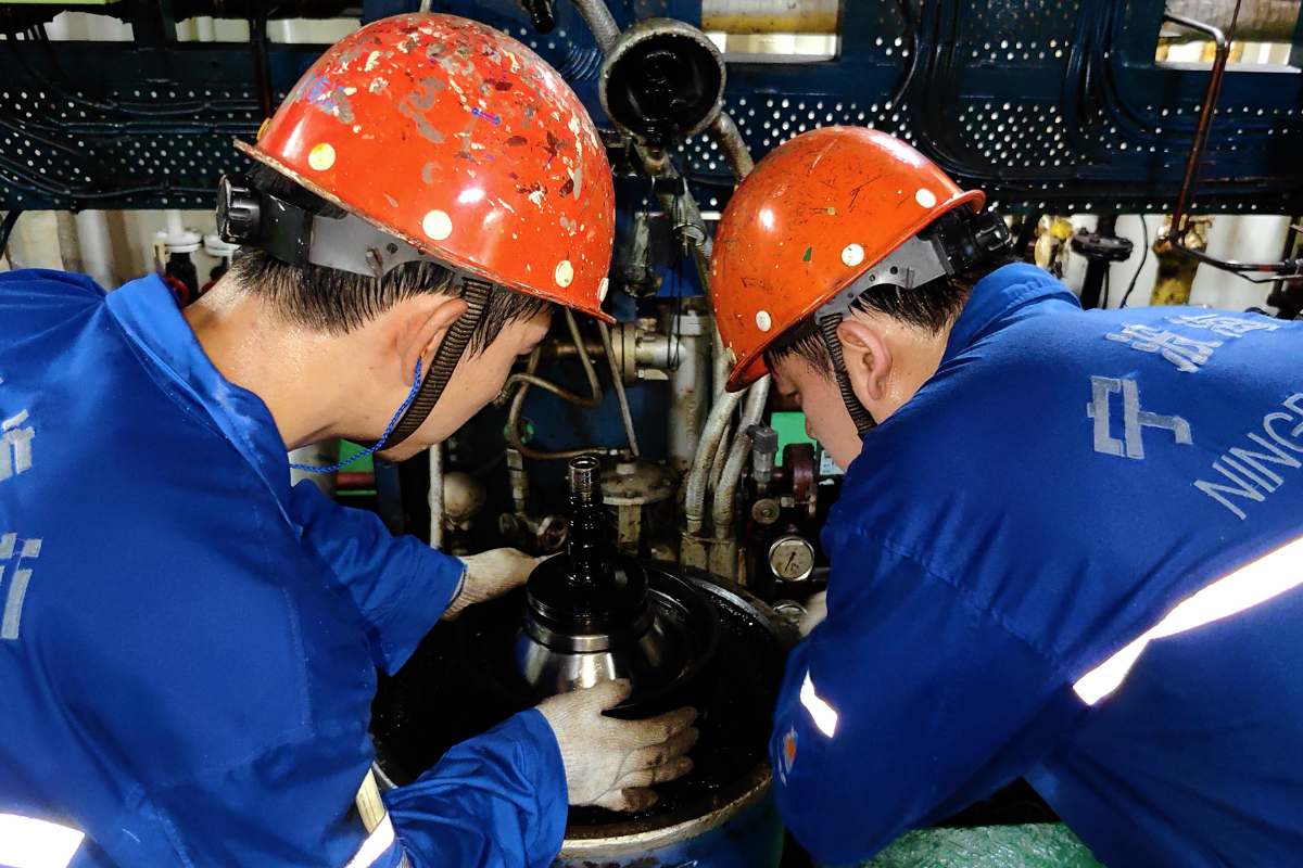 寧波海運船員在悶熱的機艙內開展設備保養。 李靖南 攝