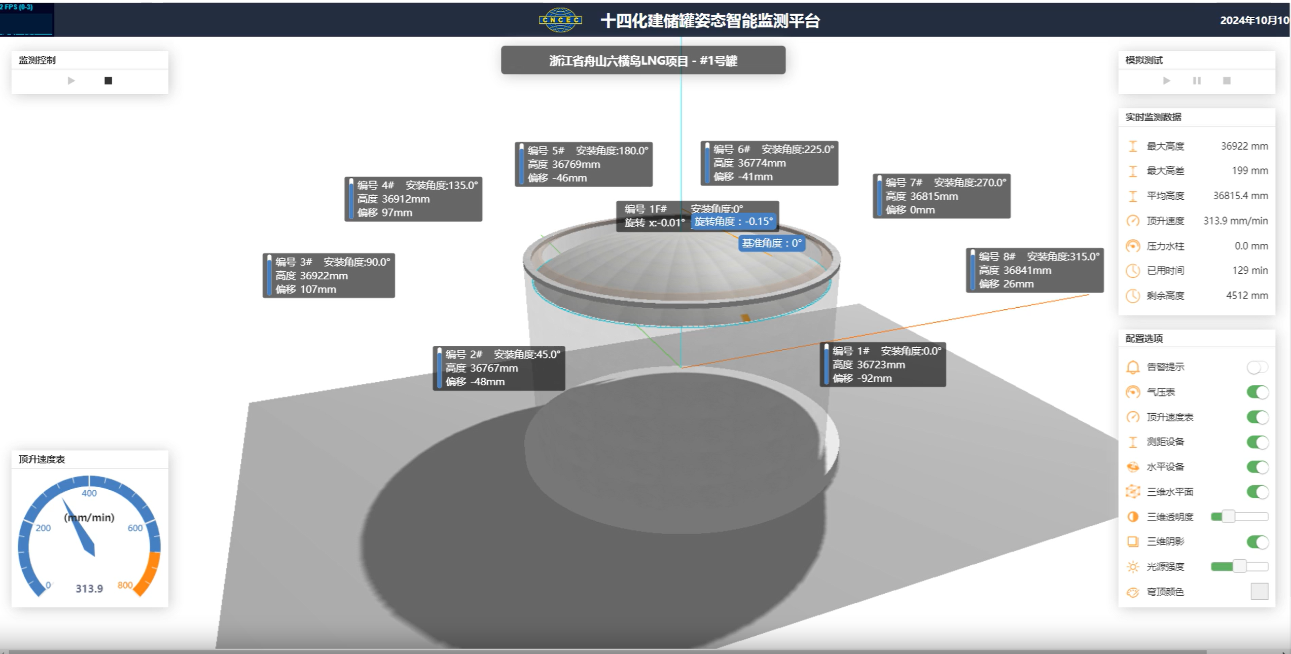為確保“鋼帽”升起均衡平穩(wěn),浙能舟山六橫LNG接收站使用了“硬核科技”——數(shù)智化頂升系統(tǒng)。該系統(tǒng)主要依托遍布罐體的“神經(jīng)”——傳感器,實時收集風(fēng)壓、平衡鋼絲繩的拉力值以及頂升方位和速度等信息,并通過三維可視化智控軟件,實現(xiàn)風(fēng)壓智能控制、拱頂智能配重、頂升方位智能糾偏等功能,大幅減少了人工操作可能帶來的誤差,讓整個氣頂升過程精準(zhǔn)、智能、安全。
