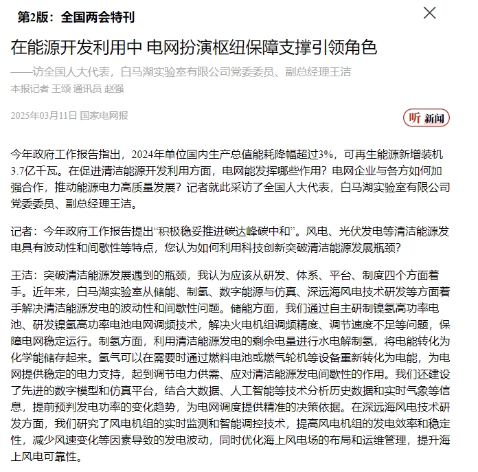 《中國電力報》報道《全國人大代表王潔:打造風電領域高水平公共實驗服務平臺》。 中國電力報 圖