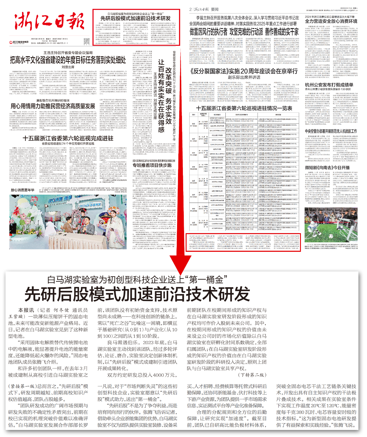 《浙江日?qǐng)?bào)》3月15日頭版報(bào)眼報(bào)道白馬湖實(shí)驗(yàn)室為初創(chuàng)型科技企業(yè)送上“第一桶金”,先研后股模式加速前沿技術(shù)研發(fā)。