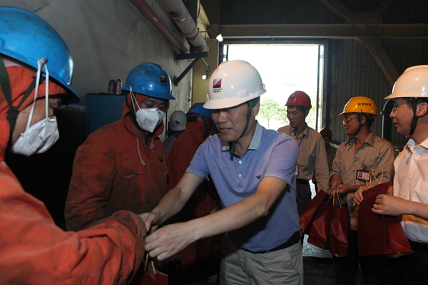 呂美溪、許強(qiáng)一行首先來到3號(hào)爐磨煤機(jī)檢修現(xiàn)場,看到奮戰(zhàn)在高溫下的嘉電人,疾步上前遞上清涼用品,并殷切囑咐道:“大家辛苦了,天氣炎熱,大家要注意身體、注意安全!”叮囑在場的部門負(fù)責(zé)人要注意職工身體情況,多輪班。隨后,呂美溪、許強(qiáng)一行來到“中國首臺(tái)超低排放機(jī)組”控制室,與精心操作的運(yùn)行人員一一握手,送上清涼用品。