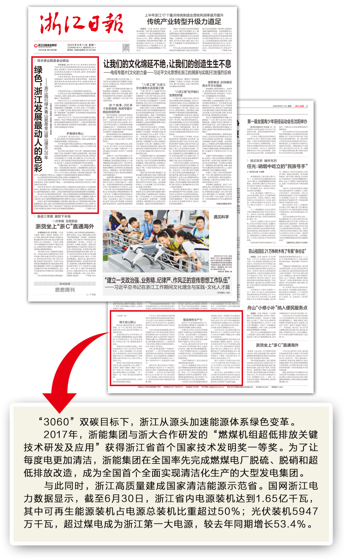 此前8月11日,《浙江日?qǐng)?bào)》頭版頭條刊發(fā)綜述稿《綠色,浙江發(fā)展最動(dòng)人的色彩——浙江踐行綠水青山就是金山銀山理念20年》,浙能集團(tuán)入列其中。 浙江日?qǐng)?bào) 提供