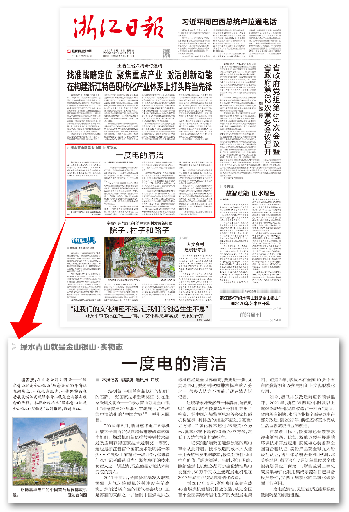 8月13日,《浙江日?qǐng)?bào)》頭版刊發(fā)《一度電的清潔》。 浙江日?qǐng)?bào) 提供