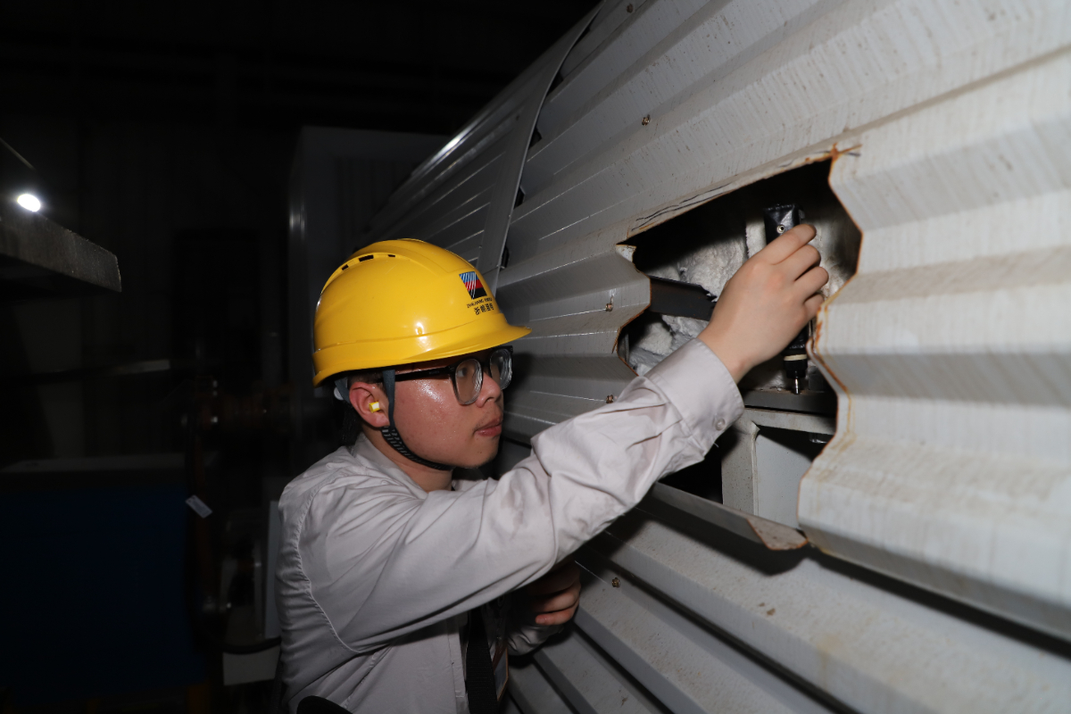 下午一點,正是一天中氣溫和負(fù)荷的“雙高峰”,毒辣的日頭懸在毫無遮攔的天空,將室外變成一個巨大的熔爐。對講機(jī)、測振儀、點溫槍、手電筒……浙能溫電四控巡檢明子堯和同事清點好裝備,出發(fā)巡檢。他背著沉重的工具包,一步一步攀上通往本體平臺的狹窄鋼梯。很快,密集的汗水沿著安全帽帶滴落,工作服外滲出成片的汗跡。