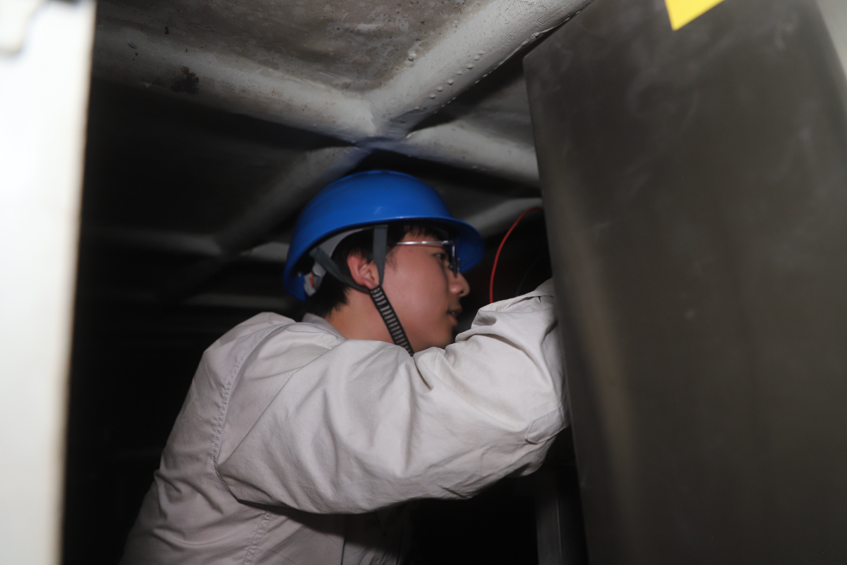 浙能溫電維護(hù)部儀控一班副班長周超泉在逼仄的空間中進(jìn)行作業(yè)。 鄭健安 攝