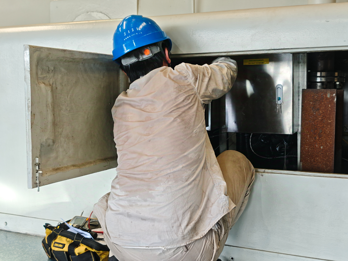 浙能溫電維護(hù)部儀控一班副班長周超泉在消缺后重新檢查設(shè)備狀況時汗?jié)竦谋秤啊?鄭健安 攝