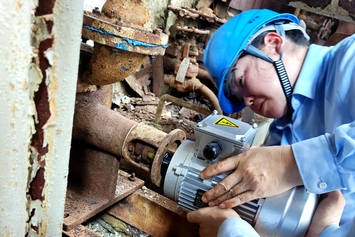 話音未落,金潔接到班長電話,要趕到9號爐MGGH登高更換超聲波吹灰器電機。接近二十斤重的電機看似不重,但需要在狹小空間內(nèi)托舉接近半小時,十分考驗力量與耐力。而同班組的王海嬌則趕往廢水預處理更換1號提升泵電機,她頂著烈日耐心地整理著電纜與接口,與同事們一起奮戰(zhàn)一上午完成了電機更換工作,等工作完畢已是汗?jié)袢怼?/p>