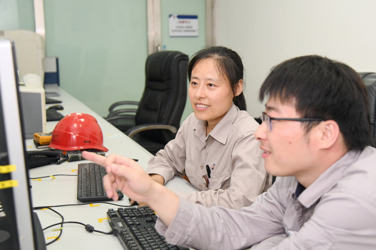 臺州電廠劉曉紅在工程師站探討。 江國勝 攝