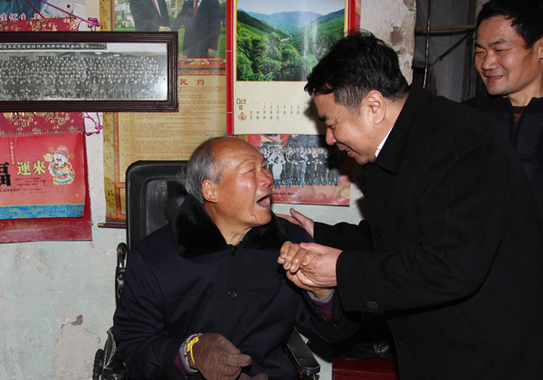 從項艷飛家中出來后,張兆都一行驅車35公里來到長興縣白峴鄉和岕口村嶺上自然村,走訪慰問居住在這里的退休職工章長福。章長福曾獲煤炭部勞模稱號,退休后因患腦溢血,生活不能自理。張兆都一進章長福家門,就握著老章和他老伴的手,噓寒問暖。在老章家簡陋的小屋里,張兆都和老章親切交談。當得知老章年輕時擔任礦井采煤隊長,勇奪高產作貢獻的事跡時,張兆都向老章伸出大拇指,連聲稱贊:“你為長廣的建設發展作出了貢獻,組織上不會忘記。今天,省總工會、浙能集團工會、長廣集團領導都來看望你,希望你生活愉快,安度晚年?!闭麻L福十分激動地說:“領導和組織時常關心、照顧著我,非常感謝?!?/p>