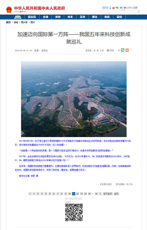 2017年,我國科技創新能力顯著提升,主要創新指標進入世界前列,科技創新水平加速邁向國際第一方陣。新華社在“兩會”召開之際,發表了《加速邁向國際第一方陣——我國五年來科技創新成就巡禮》一文,將我國在砥礪奮進五年中的重大科技創新成果進行宣傳報道,向國內外充分展示了我國科技創新實力。文章不僅展示了蛟龍、天眼、悟空、慧眼、大飛機等代表性重大科技創新成果和深地探測、干細胞、基因編輯領域的重要原創性突破,還以浙能長興地面光伏電站并網發電為代表,宣傳了我國可再生能源的快速發展,可再生能源裝機容量在近幾年的井噴式增長。
