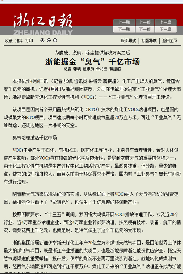 《浙江日報(bào)》報(bào)道:浙能掘金“臭氣”千億市場。 朱將云 提供