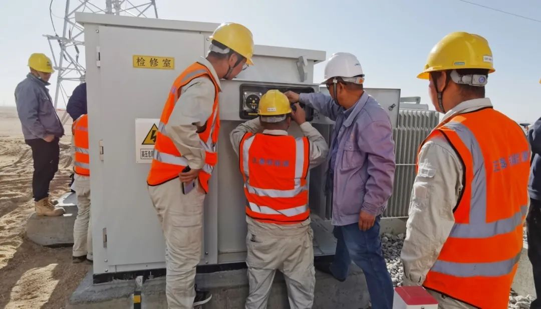 職工們進行并網(wǎng)前箱式變壓器檢查