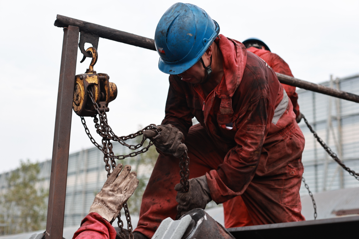 浙能港口公司檢修員在使用手拉葫蘆輔助作業。 陳宇 攝