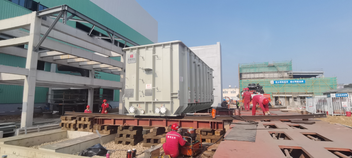 鎮聯電燃機異地遷建改造項目施工人員正進行主變設備安裝。 王向陽 攝