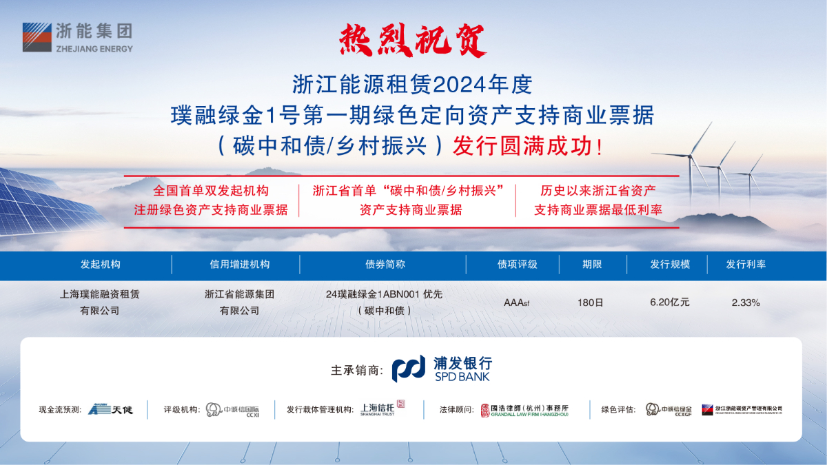 本網(wǎng)訊 1月31日,浙能集團(tuán)旗下上海璞能融資租賃有限公司成功發(fā)行浙江省內(nèi)首單“碳中和債/鄉(xiāng)村振興”資產(chǎn)支持商業(yè)票據(jù)(ABCP)。本次發(fā)行規(guī)模6.21億元,其中次級0.01億由發(fā)行人自持,優(yōu)先級獲得最高債項(xiàng)評級AAAsf,票面利率2.33%,創(chuàng)浙江省資產(chǎn)支持票據(jù)發(fā)行利率歷史新低、全國市場資產(chǎn)支持票據(jù)利率今年新低。