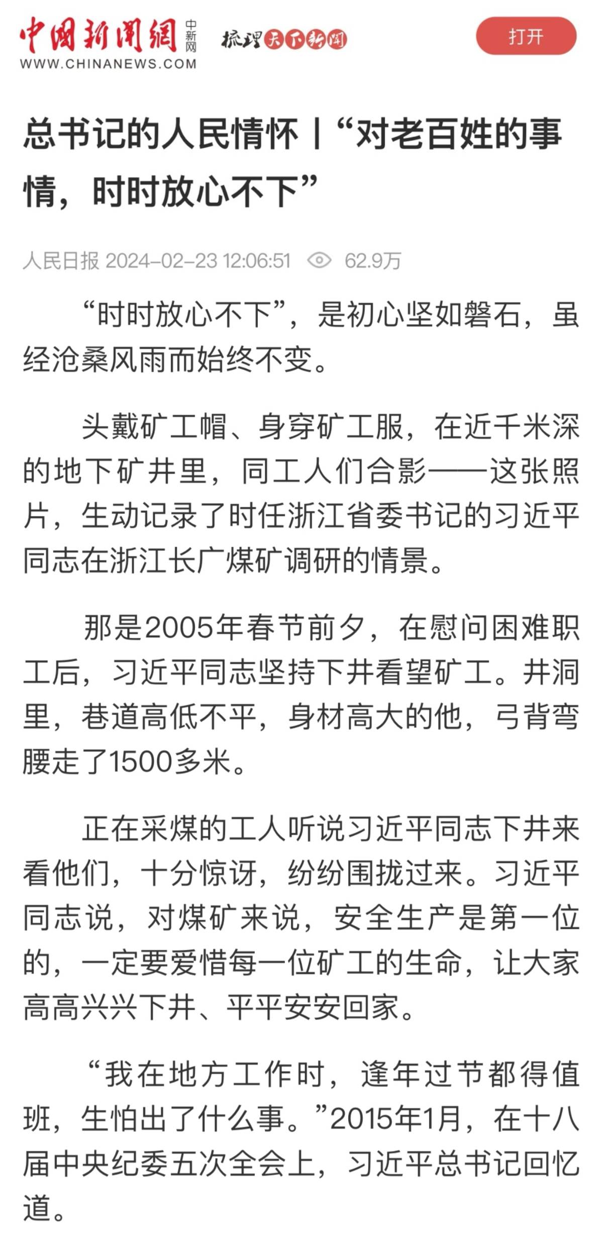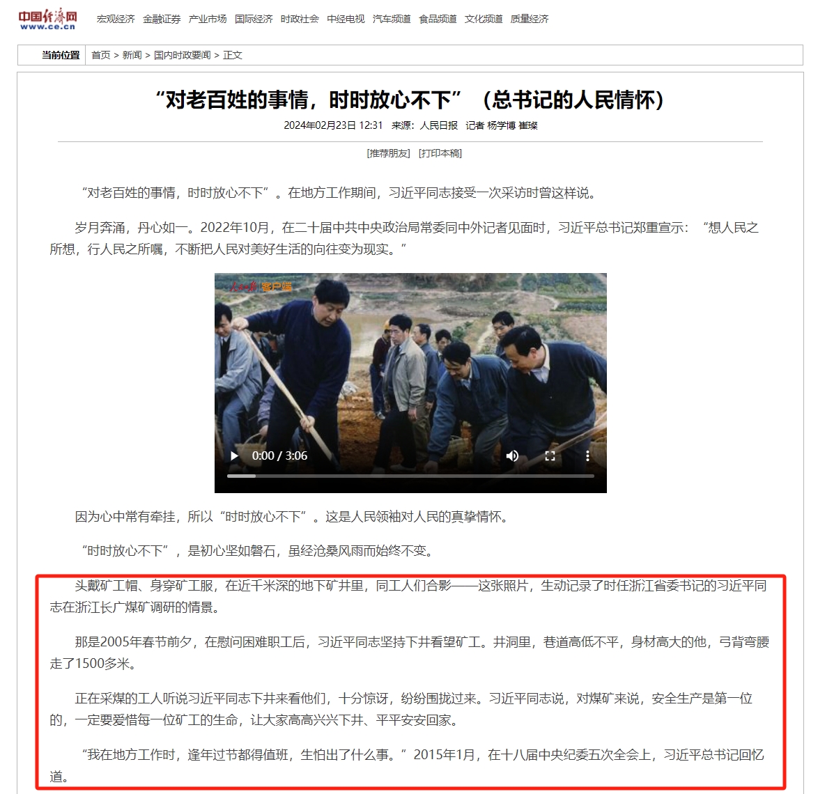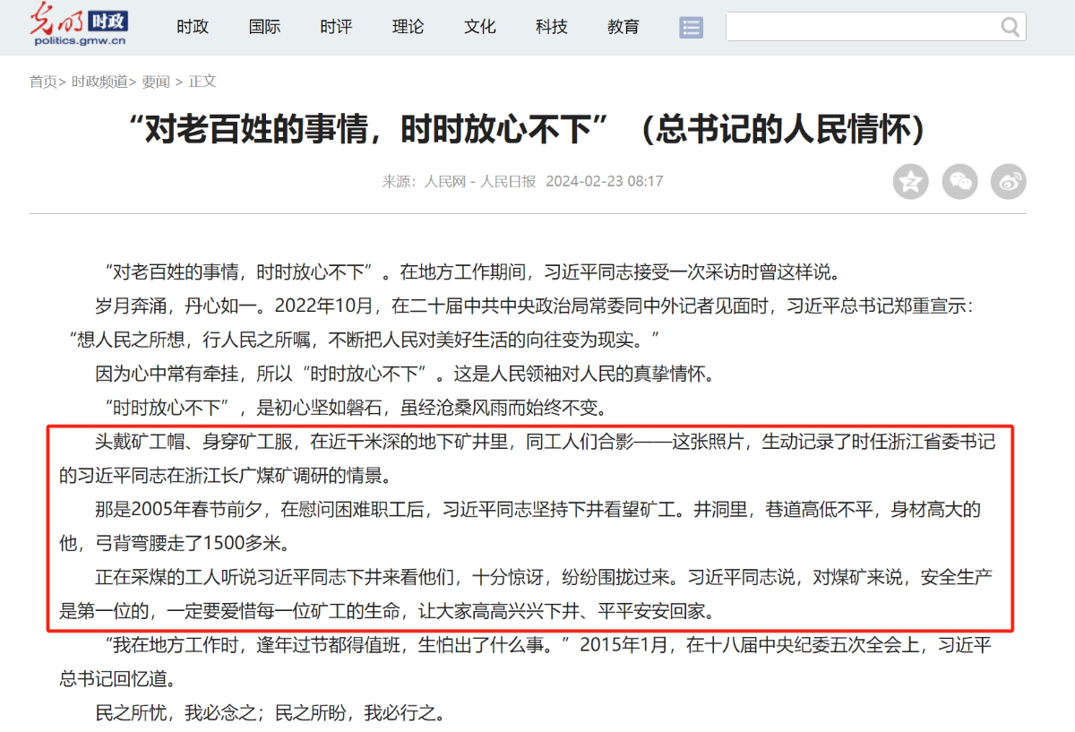 本網訊 2月23日,《人民日報》頭版頭條刊登《總書記的人民情懷|“對老百姓的事情,時時放心不下”》,光明網、求是網、中國新聞網、中國日報中文網、中國經濟網等多家央媒頭版轉載。“以時時放心不下的責任感、積極擔當作為的精氣神為黨和人民履好職、盡好責”,這是習近平總書記對廣大黨員、干部的殷切囑托,也是一個百年大黨走好新的趕考之路的底氣所在。    文中記錄了習近平總書記的調研故事,其中第一個講述的就是時任浙江省委書記習近平同志到長廣煤礦調研的故事。