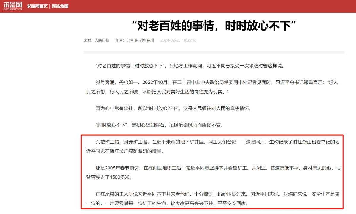 2月23日,求是網轉載《人民日報》頭版頭條文章《總書記的人民情懷》。 求是網 提供
