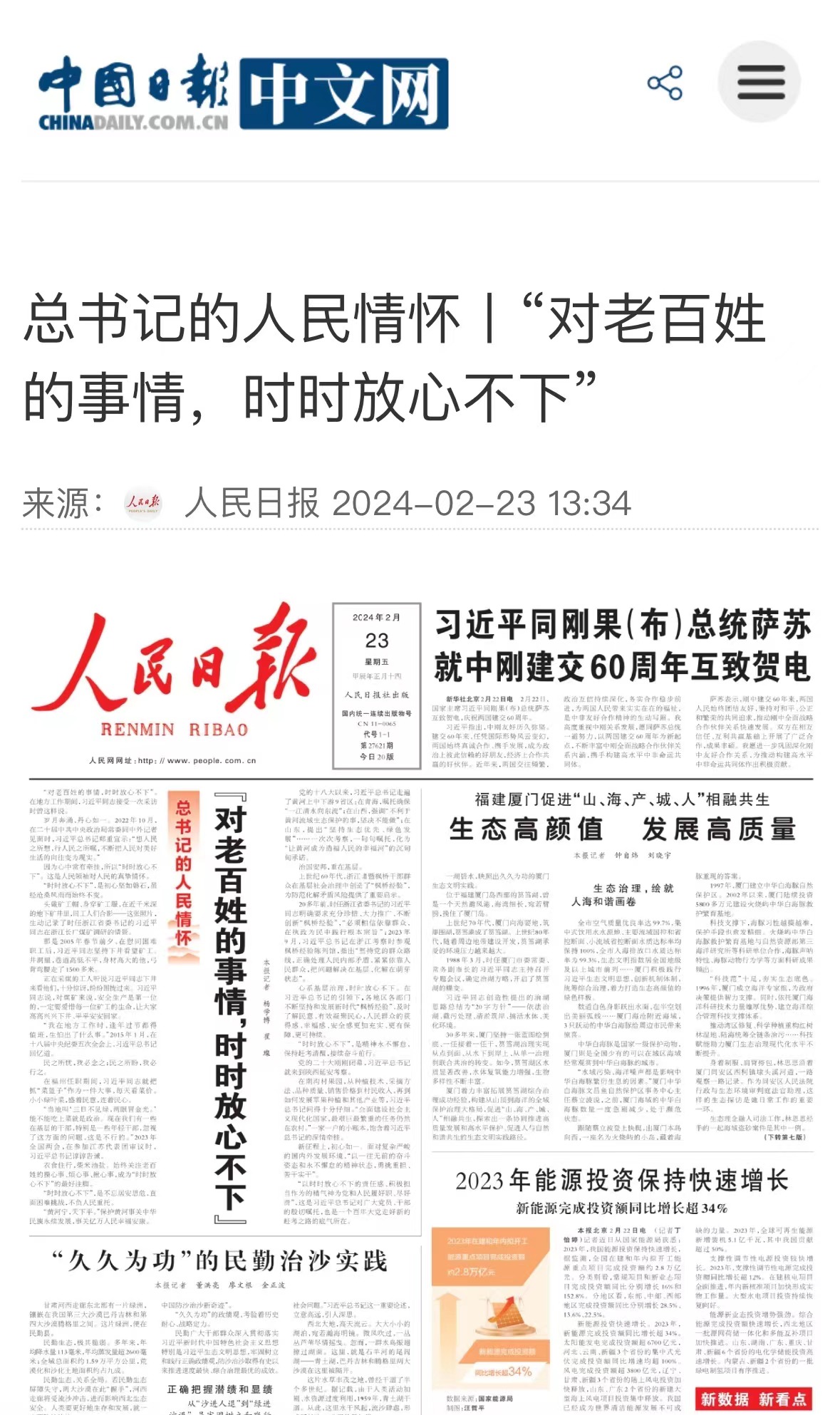 2月23日,中國日報轉載《人民日報》頭版頭條文章《總書記的人民情懷》。 中國日報 提供