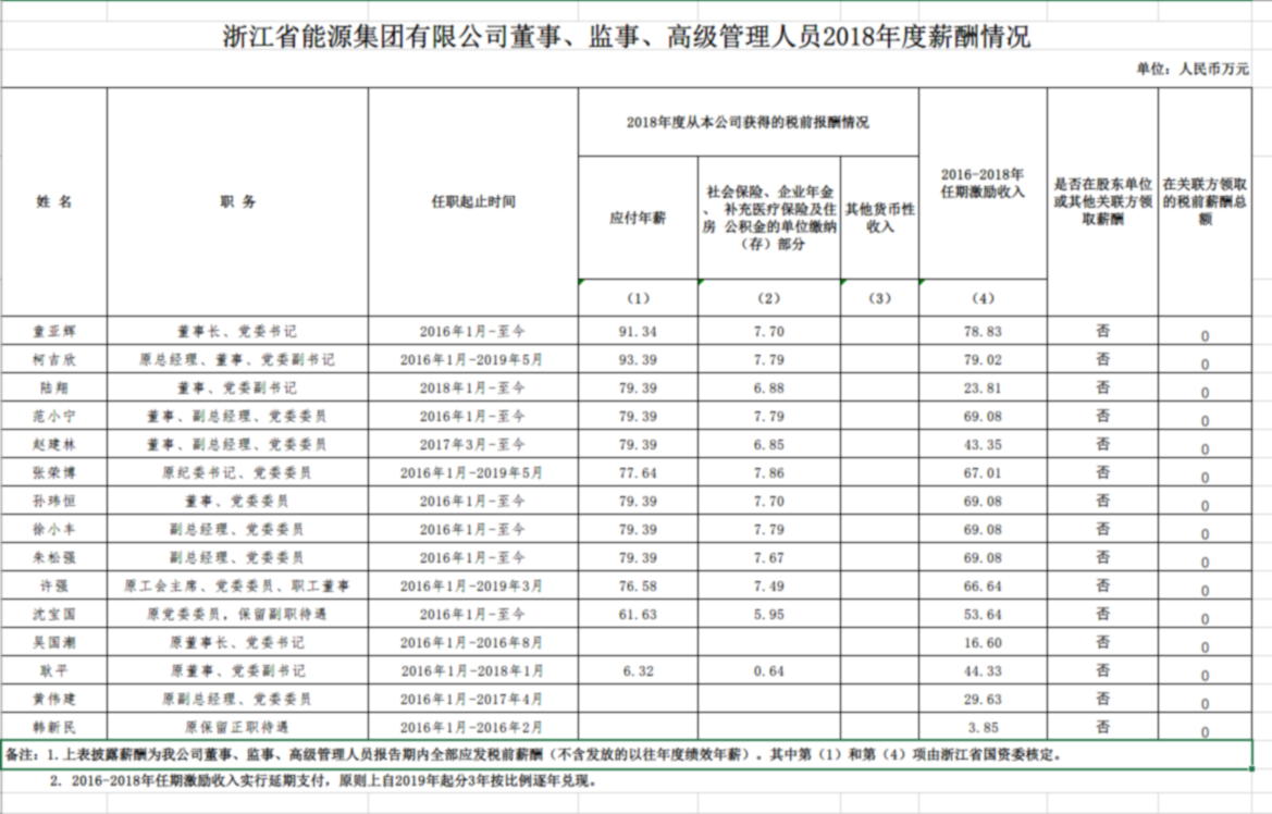 2018年度浙江省能源集團(tuán)有限公司董事、監(jiān)事、高級(jí)管理人員薪酬情況